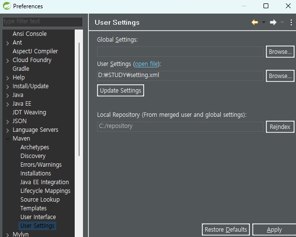 window -> preferences -> usersettings 에 settings.xml 넣어주기